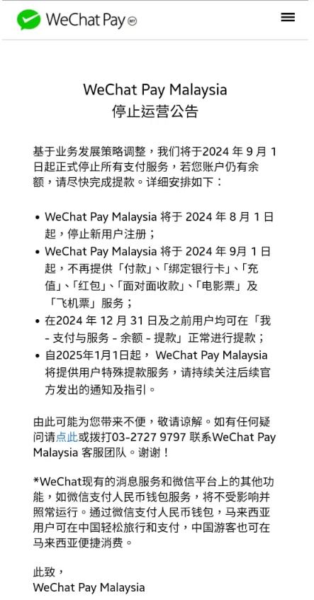 马来西亚微信支付(WeChat Pay)平台8月1日发公告表示,基于业务战略调整,从今年9月1日起,停止在马微信支付服务,并提醒用户尽快提取余额。