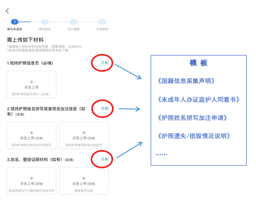 您在APP上传附加材料时,上传界面会有“示例”按钮,请您点击查看,里面有证件材料或声明模板图示(点进去只需等待几秒钟,示例图片就会加载显示出来)。请截屏下载后打印或抄写有关声明模板,填入个人情况,签字后拍照上传即可。