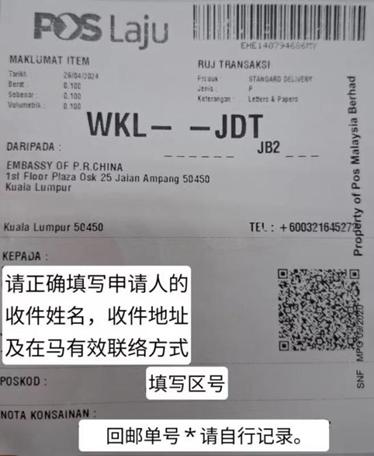 5、准备好已付邮资的回邮信封,填好收件人姓名和地址(POS LAJU回邮信封需提供贴纸式回邮单)。