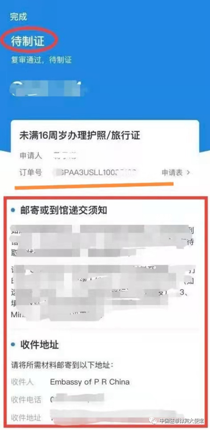 答:在APP上收到“待制证”信息并完成缴费后,请将以下材料寄至使馆: